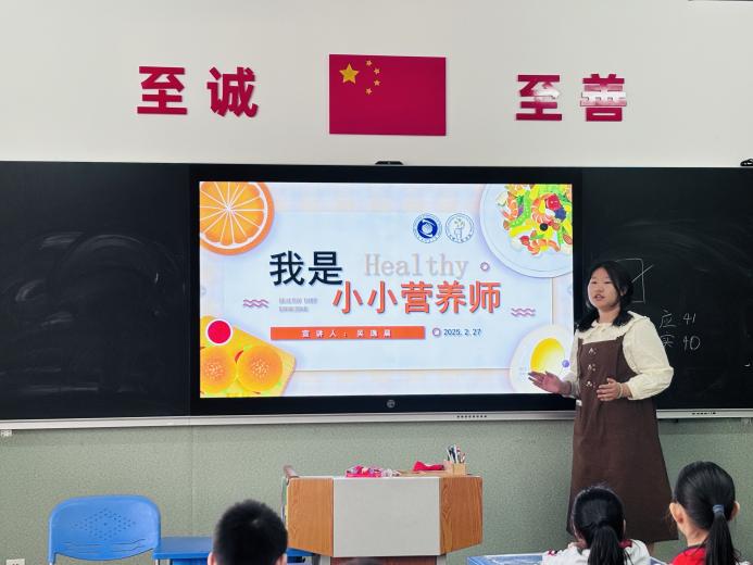 课后服务志愿者吴逸晨结合专业知识,以生动有趣的方式通过色彩鲜艳的图片和简单易懂的语言,向小朋友们详细讲解了食物营养的基本知识,以及如何通过均衡饮食来维持身体健康,同时通过形象的膳食宝塔模型,向小朋友们展示了每天应该摄入的各类食物比例,帮助他们理解“吃得好”不仅仅是吃饱,更是吃得科学、吃得健康。同时开展“光盘行动”倡议,用实际例子告诉孩子们,粮食的来之不易以及浪费食物的严重后果,鼓励小朋友们从自身做起,珍惜每一粒粮食,养成节约的好习惯,并带动身边的人一起践行“光盘行动”,为减少食物浪费贡献自己的力量。