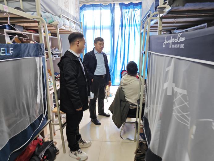 党委书记杜岩刚,党委副书记曾昭晔带队对学生宿舍安全,卫生进行全面检查。