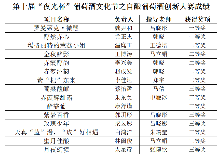 经过激烈的比拼和评委们严谨细致的评审,最终评选出一等奖2组、二等奖5组、三等奖8组。这些获奖团队凭借扎实的专业知识、精湛的酿造技艺、独特的创意构思和出色的团队协作精神,为本次大赛画上了圆满而精彩的句号,也为全校师生呈现了一场高水平、高质量的葡萄酒文化盛宴,充分展示了禁漫天堂app