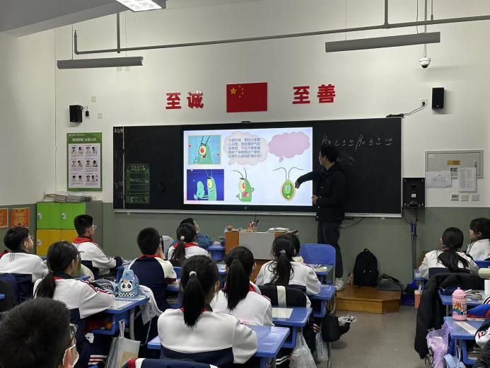 课后服务志愿者2023级本科生尤正杰通过图片、动画和视频的形式介绍了单细胞生物-草履虫、变形虫、衣藻,并介绍了单细胞生物的细胞结构和生活方式,最后介绍了单细胞生物与人类的生活息息相关,拓宽了小学生的视野,为小学生打开了生物知识的大门。