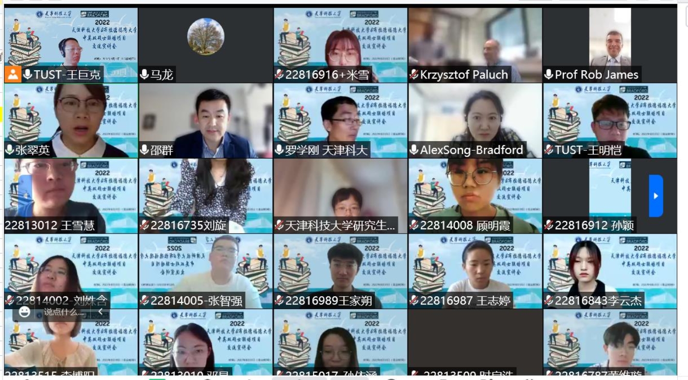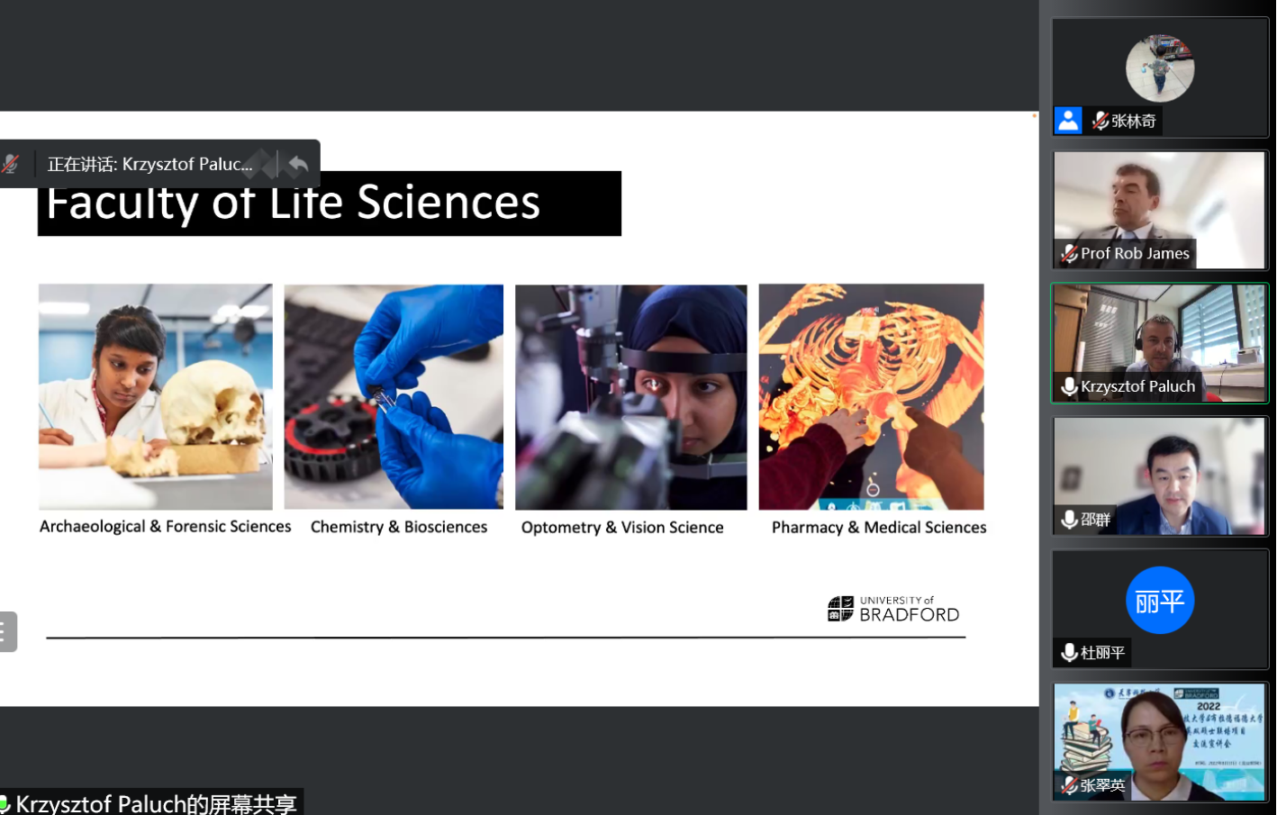与布拉德福德大学硕士双学位联合培养项目举办2022年线上交流宣讲会。英国布拉德福德大学生命科学禁漫天堂app院长Rob James、副院长Mohammad Isreb、副院长Krzysztof Paluch和该校开放式创新中心副主任邵群、中国办公室副主任宋峥,我校国际交流处副处长赵佩钦、研究生院副院长万丽丽、禁漫天堂app
