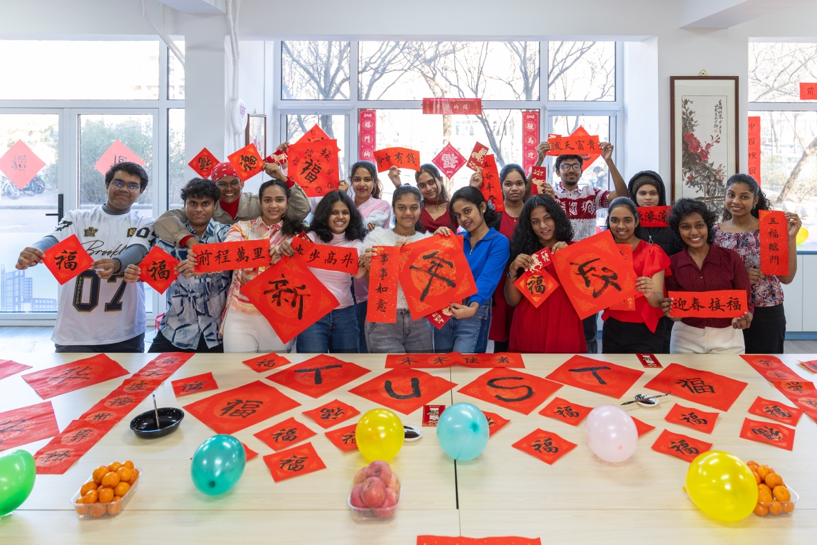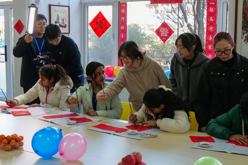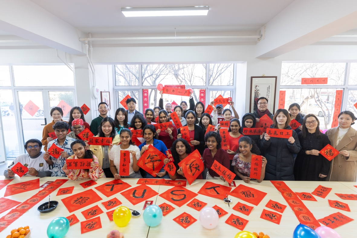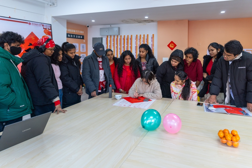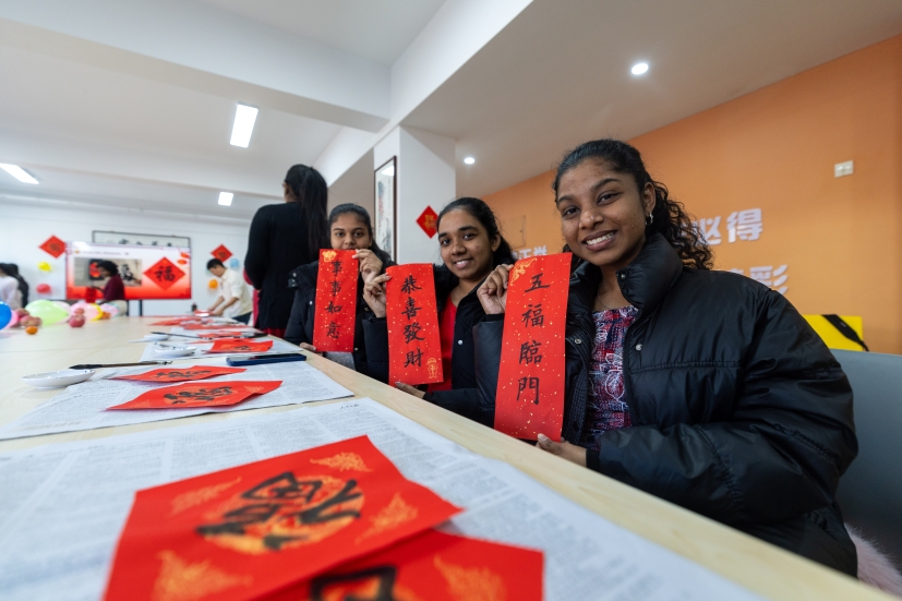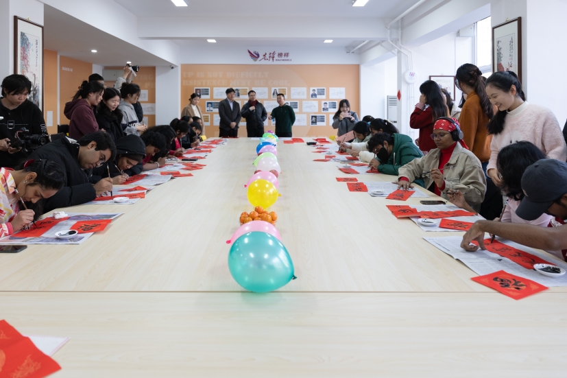 滨海校区学生一公寓一站式活动室内张灯结彩、墨香萦绕,一场别开生面的“墨香迎春·福满宿舍”活动在此盛大举行。16名2025级斯里兰卡本科留学生踊跃参与,他们跨越山海,带着对中国文化的向往与好奇,全身心投入到这场春节文化体验盛宴中,为冬日的校园增添了一抹温暖而绚丽的色彩,也为中外文化交流注入了新的活力。