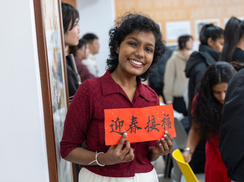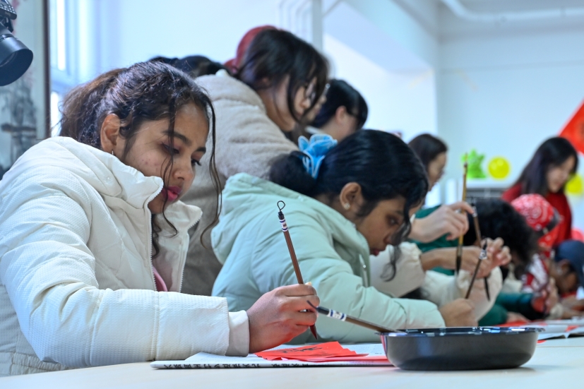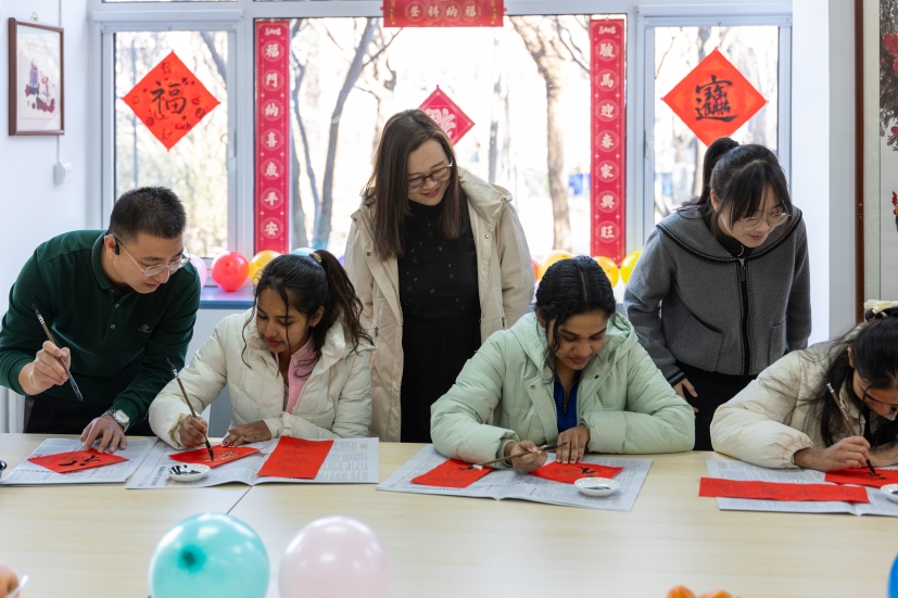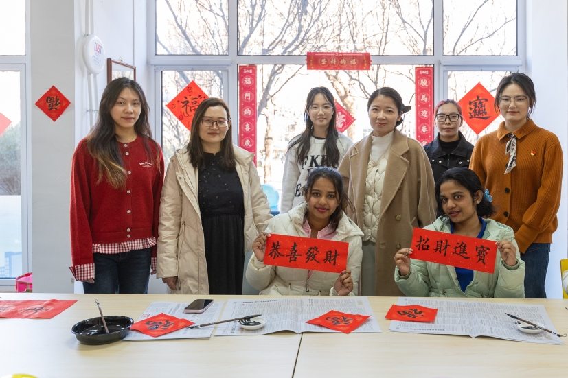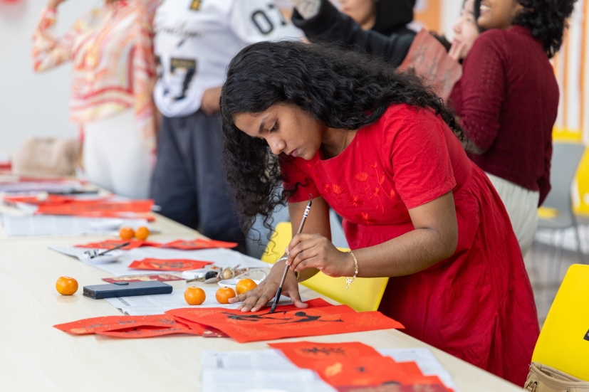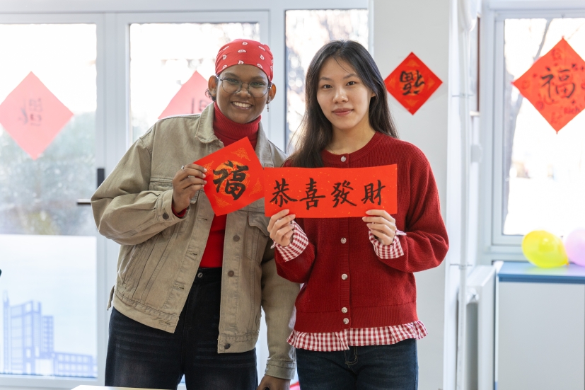 滨海校区学生一公寓一站式活动室内张灯结彩、墨香萦绕,一场别开生面的“墨香迎春·福满宿舍”活动在此盛大举行。16名2025级斯里兰卡本科留学生踊跃参与,他们跨越山海,带着对中国文化的向往与好奇,全身心投入到这场春节文化体验盛宴中,为冬日的校园增添了一抹温暖而绚丽的色彩,也为中外文化交流注入了新的活力。
