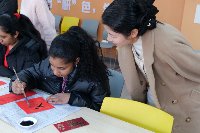 来自斯里兰卡的邓家豪兴奋地说:“这是我第一次拿毛笔写字,感觉特别新奇。虽然写得不太好,但我会把这张自己写的福字带回家,让家人也感受一下中国春节的氛围。”