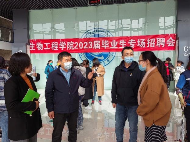 2023年春季专场招聘会在滨海中校区体育馆举行。本次招聘会吸引了来自华熙生物科技(天津)有限公司、浙江震元制药有限公司、中科蓝海(天津)科技有限公司等56家生物医药类企业参加,来自全校相关专业的1000余名学生来到招聘会现场,询问岗位需求、投递个人简历。