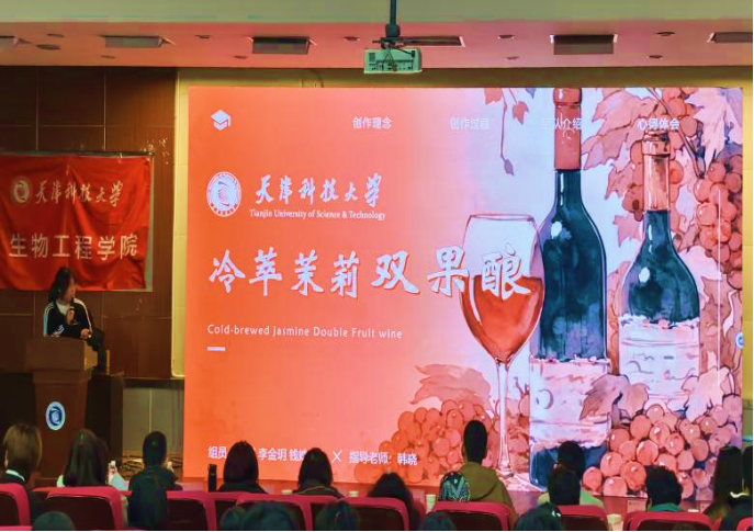 从葡萄品种选择到发酵工艺改良,从风味调试到包装创意,各队伍既遵循传统酿酒技艺的精髓,又融入年轻化的创新巧思——有的团队尝试添加其他原料如茉莉花、玫瑰、凤梨、橙香等提升香气层次,有的则通过控制发酵温度打造更清爽的口感。不论是作品名称还是实物口感,每一个小细节都展现了生工学子将专业知识转化为实践创意的能力。