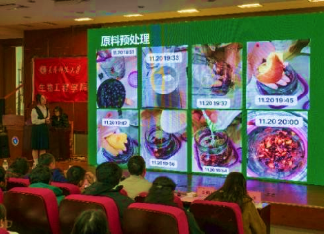 决赛现场中,参赛团队通过逐一现场PPT展示酿酒过程与心得,自酿葡萄酒色泽、口感等专业品鉴,成绩由“初赛(30%)+决赛品鉴和展示(70%)”综合评定。