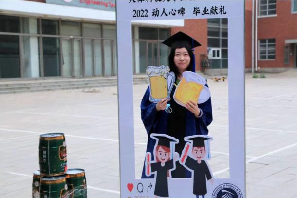 毕业学子与禁漫天堂app教师纷纷在禁漫天堂app特制的“动人心啤毕业献礼”主题背景板处合影留念,手持各式啤酒杯的拍照板,留下青春年华中最美好的回忆。
