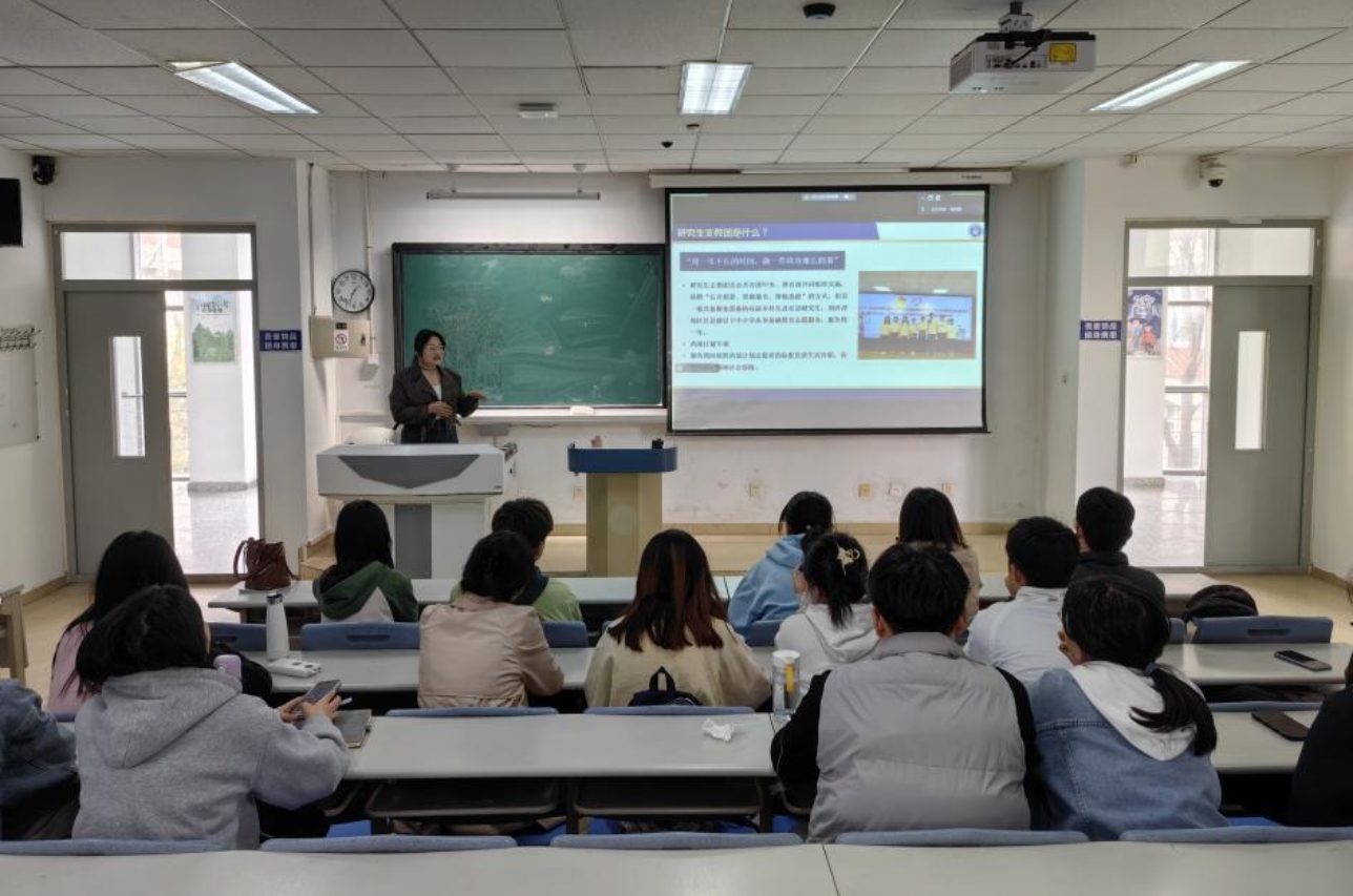随后,第24届研究生支教团的张雨涵同学从可预见的困难、可期待的收获、可掌握的选拔条件、可准备的面试要点四个方面逐一介绍,她用“用一年不长的时间,做一件终身难忘的事”概括了自己一年的支教经历,并鼓励与会同学积极扎根基层、服务基层,在新时代新征程上留下无悔的奋斗足迹。