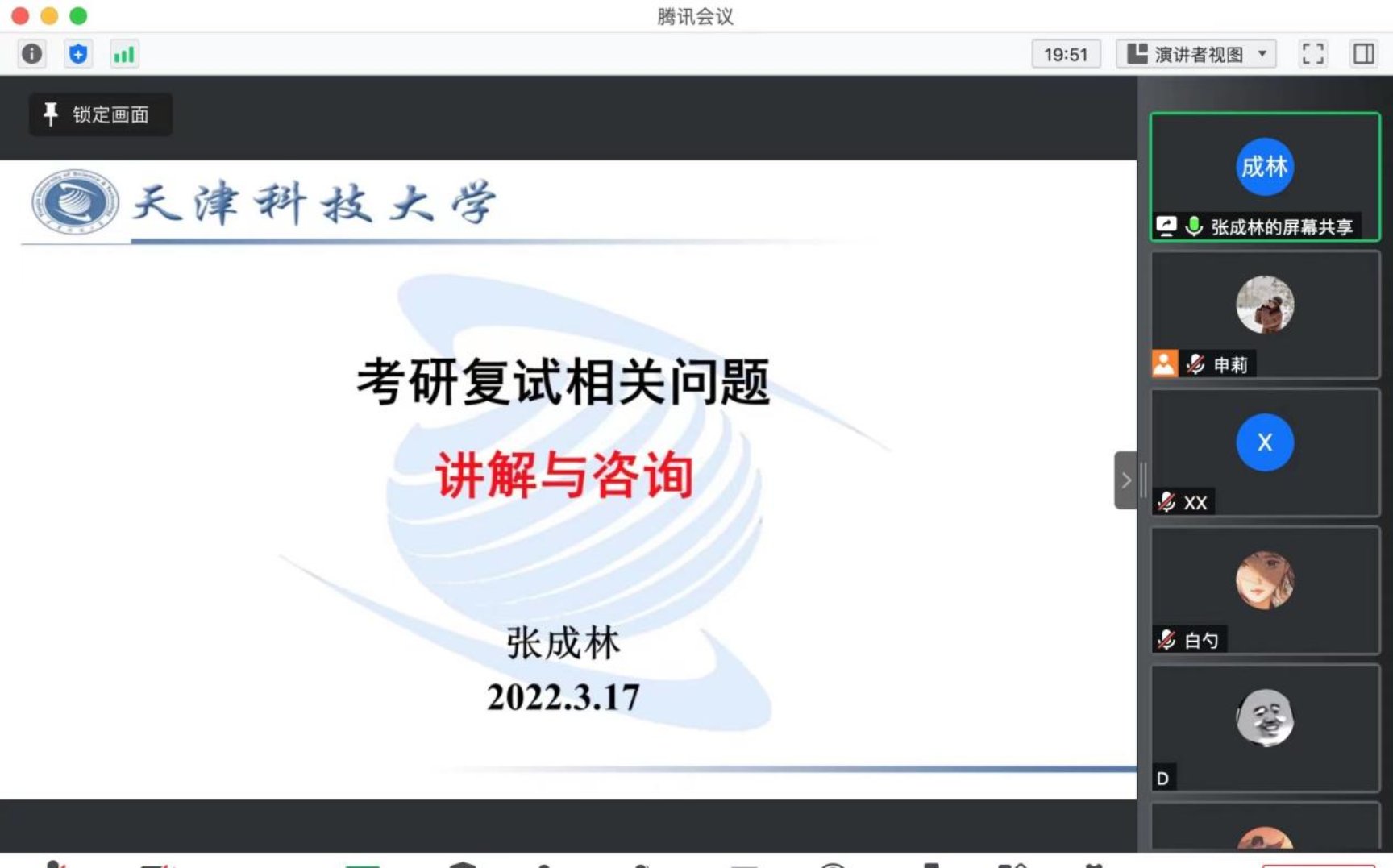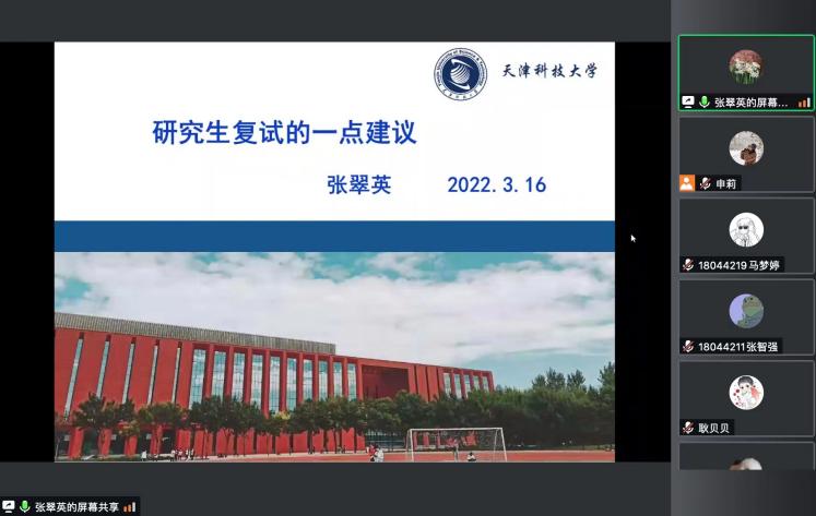 张翠英院长对禁漫天堂app历史沿革、禁漫天堂app授予学位点情况、教学情况、立体健全的研究生学位建设情况进行了详细介绍,并从认识复试、准备复试和复试过程三个层面给出自己的建议。张成林教授从研究生导师和复试面试官的角度出发,从目前的任务、复试注意事项及技巧、如何选择导师三个方面做了深入细致的分享,并对同学们在复试过程中能够锦上添花的高亮部分进行解释和点拨。王巨克老师针对今年线上复试的形式给学生们介绍了网络复试准备相关内容。