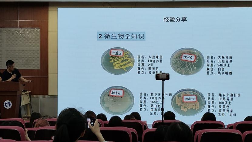 本科生李小雨和高明英作为负责人分享了参赛经验,从创作灵感、制作材料、制作过程、作品拍摄、文案撰写、内涵挖掘等方面讲解了获奖作品,强调一定的微生物知识储备和基本的微生物实验操作是在微生物培养皿中发挥绘画创意的基本前提,分享了微世界艺术大赛对她们走近科研、乐享科研的重要启蒙作用。