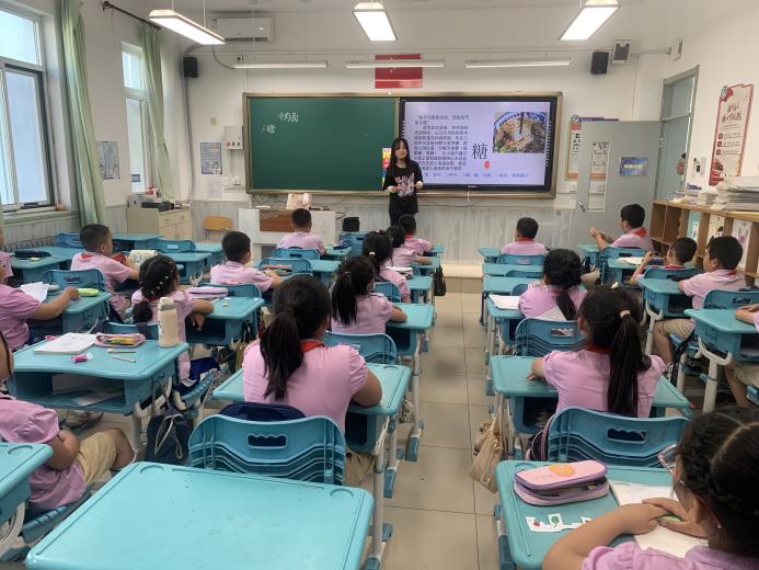 双减课后服务志愿者2022级本科生王绍涵以家乡美食山东馒头为引例,通过与视频的巧妙结合生动形象的向同学们详尽介绍了人体所需的七大营养素,倡导孩子们遵从居民膳食宝塔合理选择食物。